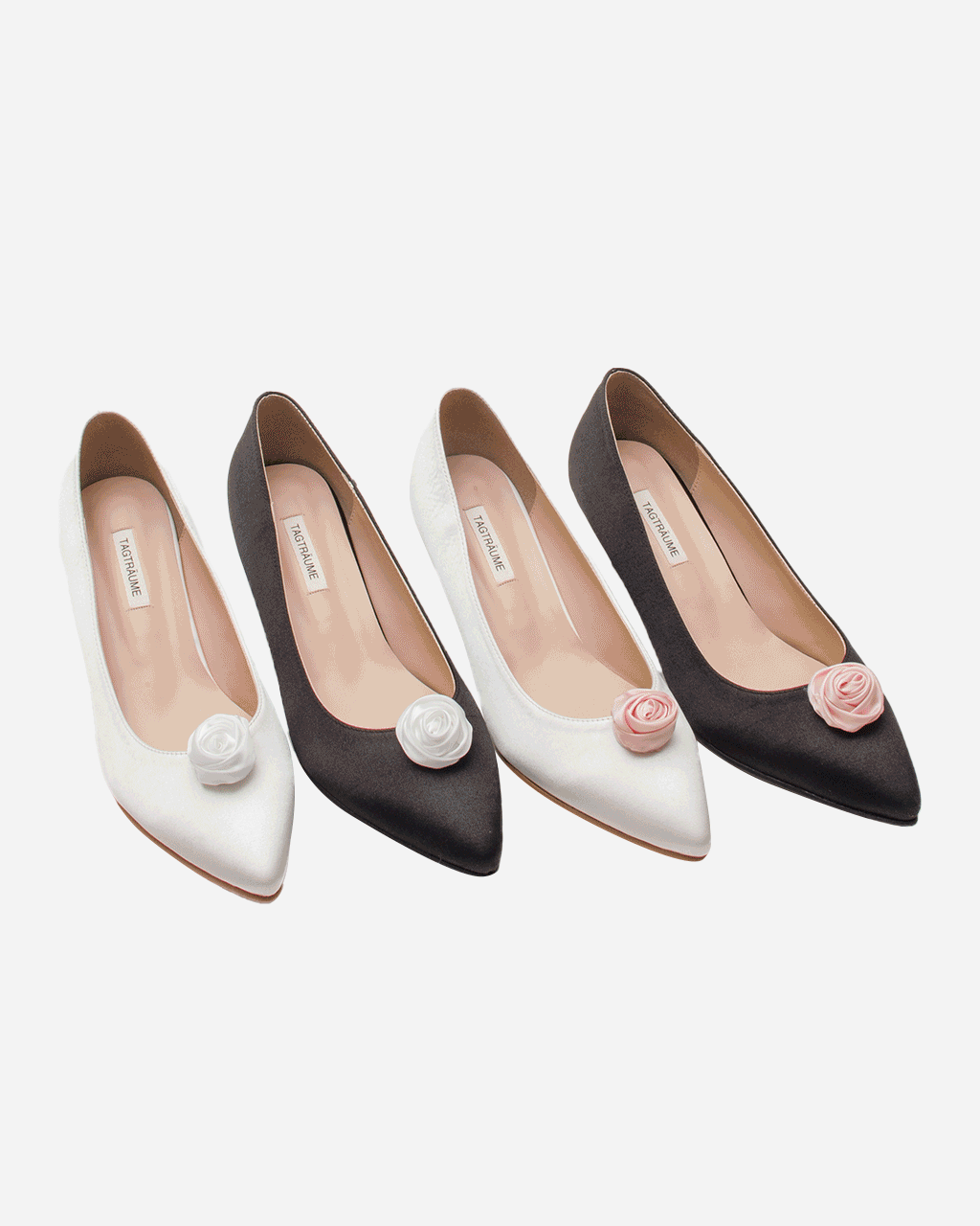 - [WEDDING/국내제작/220-270mm] Marsha 마르샤 코사지 포인티드 새틴 미드힐 펌프스 웨딩 슈즈